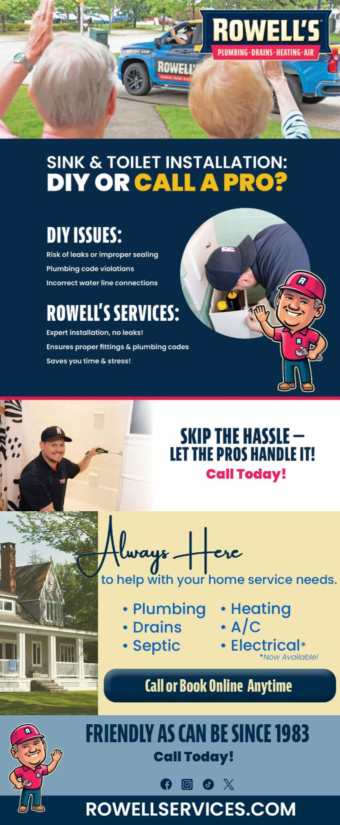"Friendly As Can Be Since 1983!" When you need help with your plumbing, drains, heating, cooling or electrical in Plymouth, you can always rely on Rowell's Services! Call us now or book online!